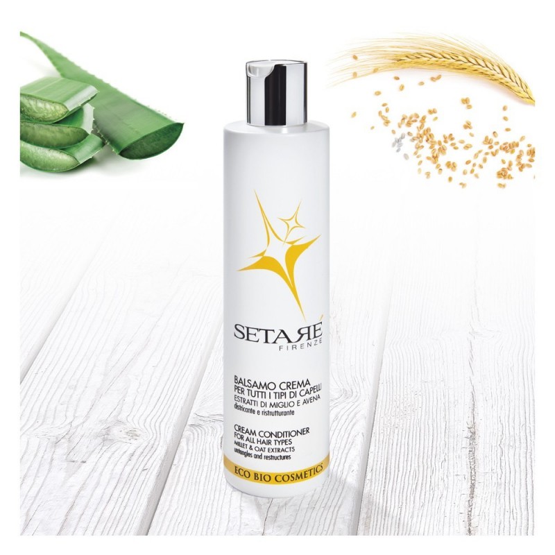 INCI: Aqua [Water], Cetearyl alcohol, Behenamidopropyl dimethylamine, Myristyl myristate, Aloe barbadensis extract (*), Avena sativa (Oat) bran extract (*), Panicum miliaceum extract (*), Prunus amygdalus dulcis (Sweet almond) fruit extract (*), Helianthus annuus (Sunflower) seed extract (*), Lactic acid, Parfum [Fragrance], Benzyl alcohol, Sodium benzoate, Sodium dehydroacetate, Glycerin, Benzyl salicylate, Xanthan gum, Coumarin, Linalool, Hexyl cinnamal. (*) da agricoltura biologica / from organic agricolture.