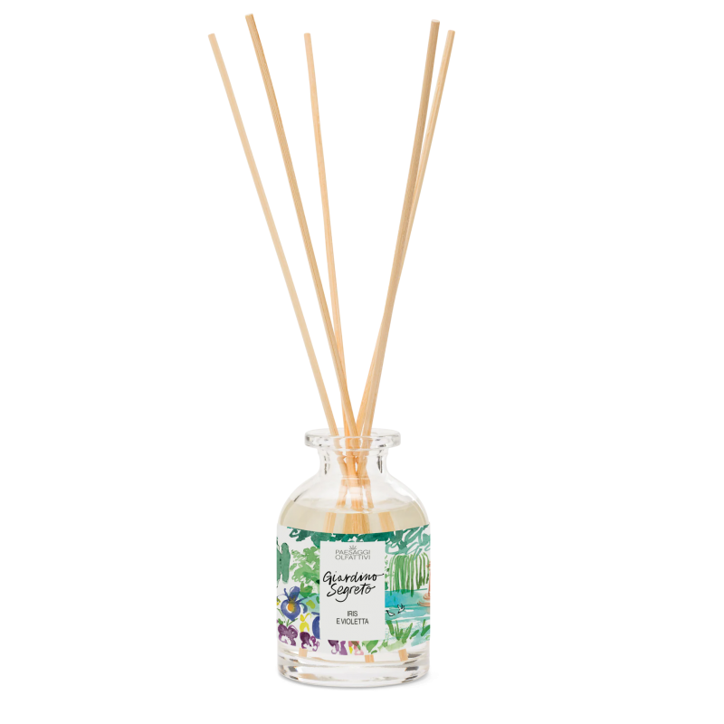La piramide olfattiva del profumatore a bastoncino “Giardino Segreto” rievoca la freschezza e l’eleganza di un parco primaverile in città, dove natura e architettura convivono in armonia.